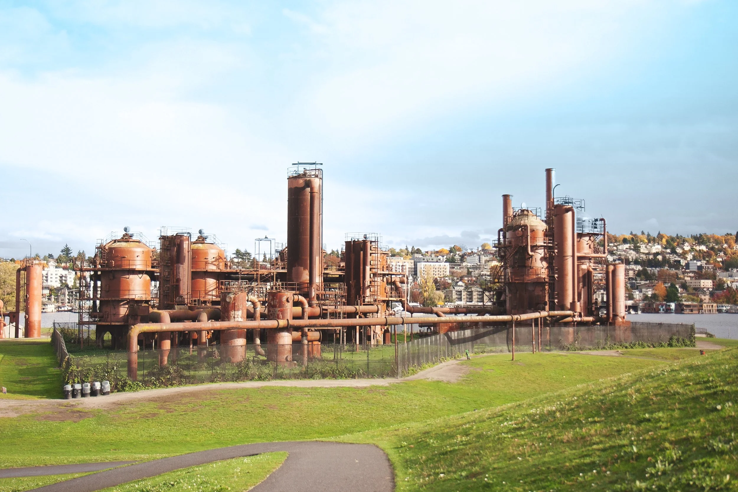 Gas Works Park, on the north shore of Lake Union in Seattle’s Wallingford neighborhood, is a 19-acre park built on the former Seattle Gas Light Company plant. Its preserved industrial structures create a unique backdrop for picnics, kite flying, or simply enjoying the views. The park connects to the Burke-Gilman Trail, a scenic 12.5-mile route to Kenmore, perfect for walking, biking, or running along the waterfront.